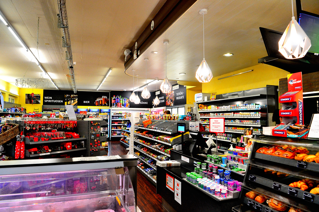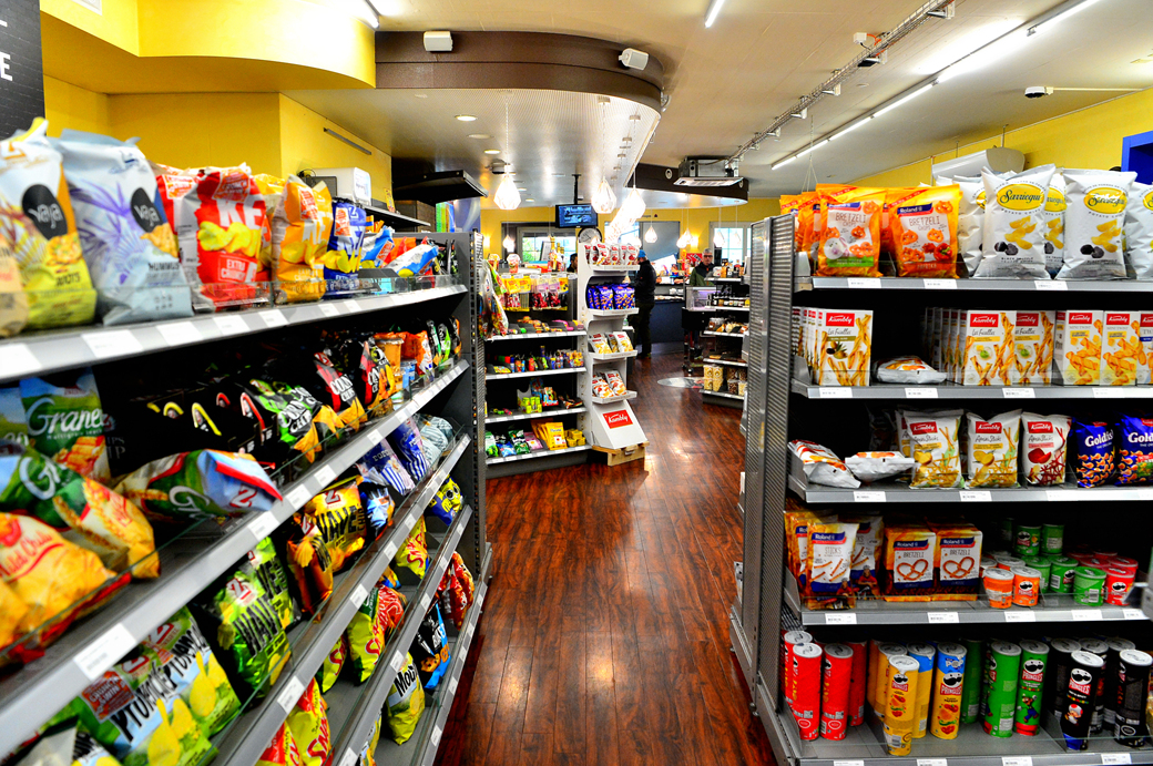 휴게소에 딸린 작은 마트에서 필요한 물품을 물색한다.