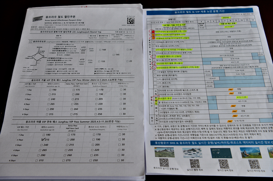 더불어 받은 동신 VIP 패스 두 장~ 이 패스로 이용할 수 있는 내용들이 빼곡히 적혀 있다. 그리고 이곳의 대표적인 마트 쿱 Coop의 할인권과 함께 빨간색의 융프라우 철도 기념 여권, 파란색 형광펜으로 우리들의 출발 시간을 마크한 시간표까지 꼼꼼히 챙겨준다. 융프라우에서 내려올 때 타야 할 산악열차 시간까지 마킹해서~