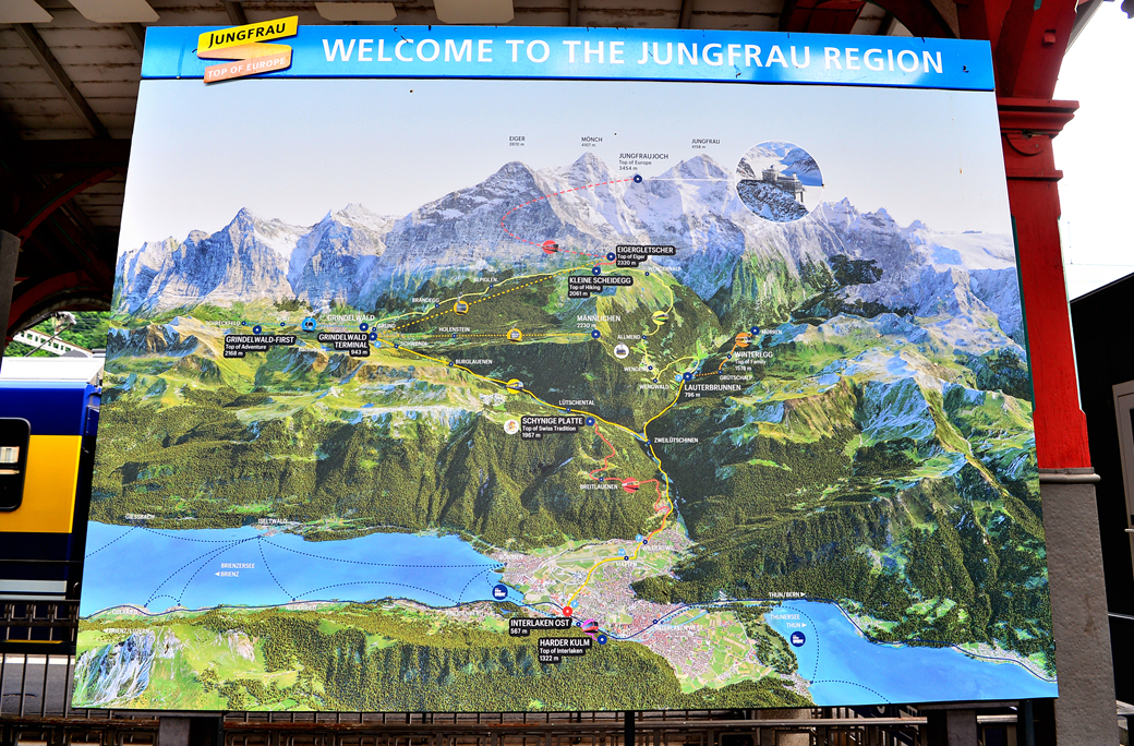 융프라우 지역을 보여주는 안내판인데, 사진 같은 모습이 현실감 있게 다가온다.