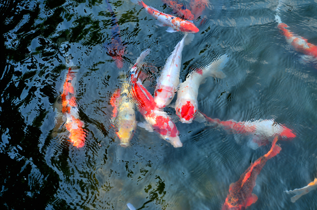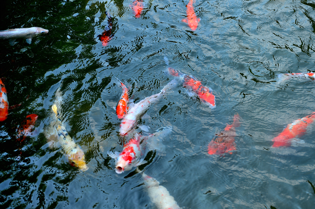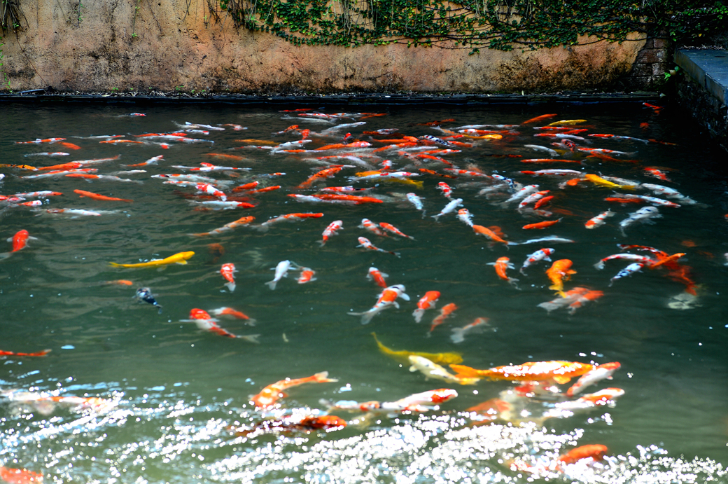 항아리 분수를 만들어 놓은 연못에는 형형색색의 많은 황금잉어들이 노닐고 있다.